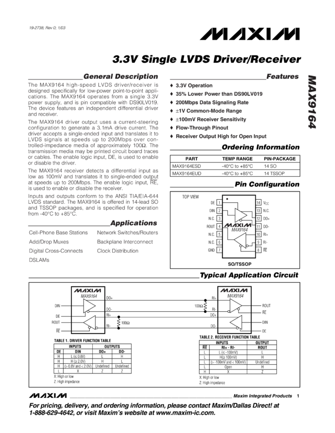 MAX9164 3.3V Single LVDS Driver/Receiver