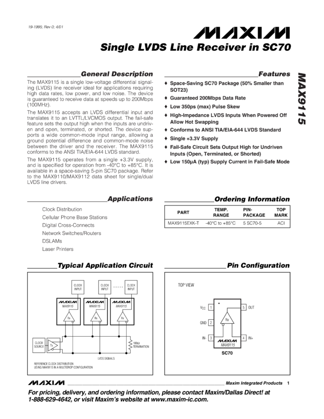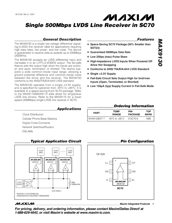 MAX9130 Single 500Mbps LVDS Line Receiver in SC70