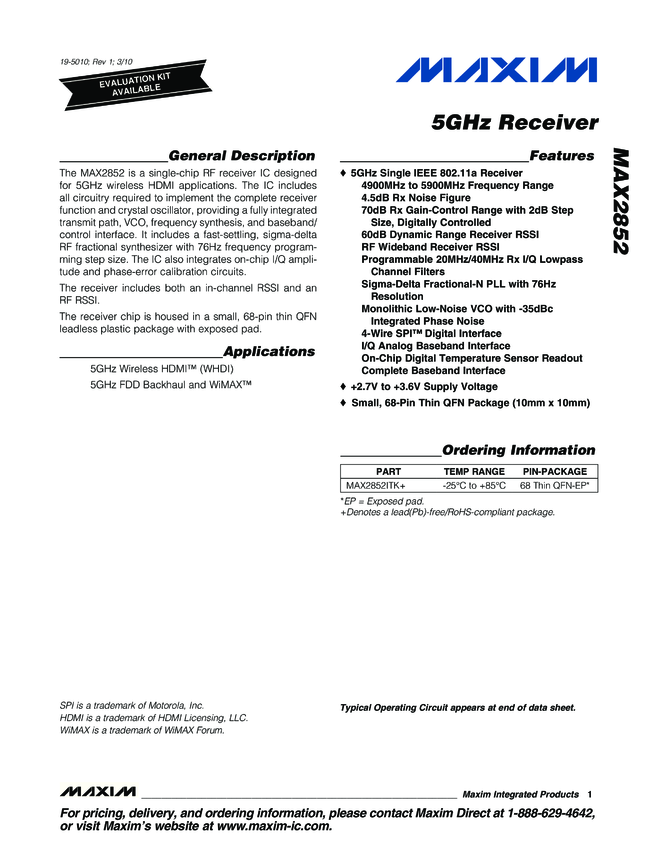 MAX2851 5GHz, 5-Channel MIMO Receiver
