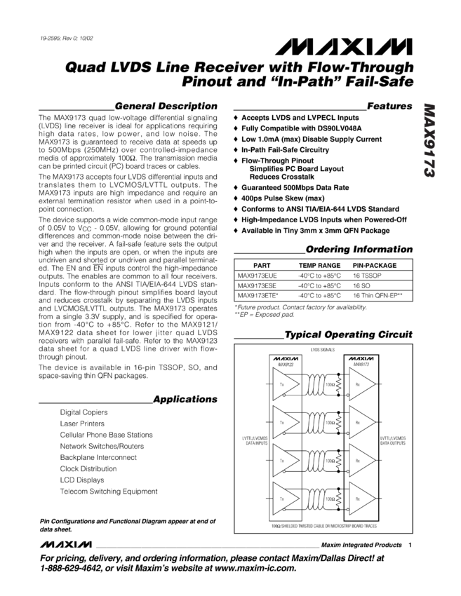 MAX9173 Quad LVDS Line Receiver with Flow-Through Pinout and "In-Path" Fail-Safe