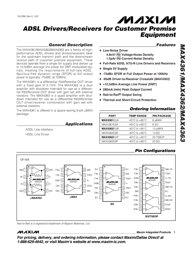 MAX4361, MAX4362, MAX4363 ADSL Drivers/Receivers for Customer Premise Equipment