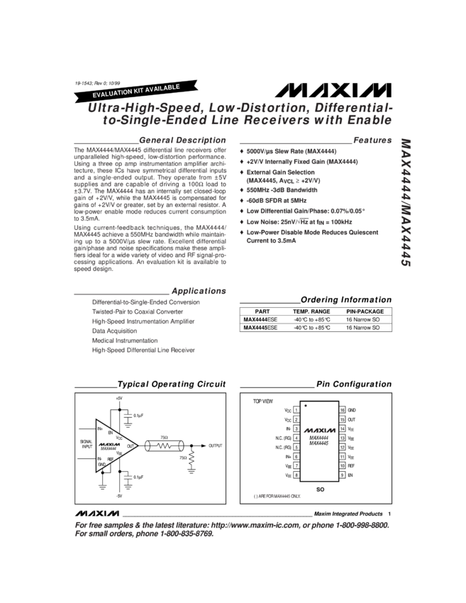 MAX4444, MAX4445 Ultra-High-Speed, Low-Distortion, Differential-to-Single-Ended Line Receivers with Enable