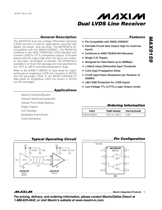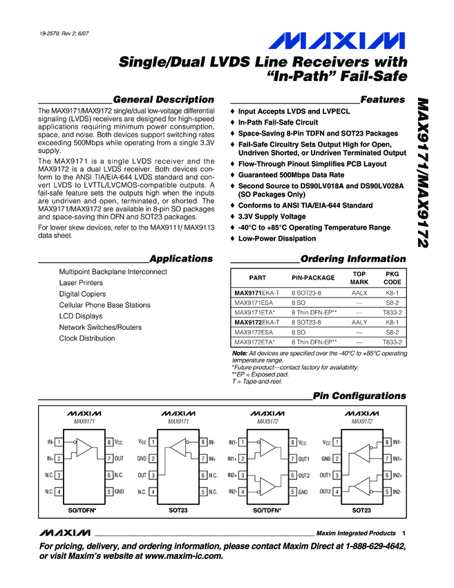 MAX9171, MAX9172 Single/Dual LVDS Line Receivers with "In-Path" Fail-Safe