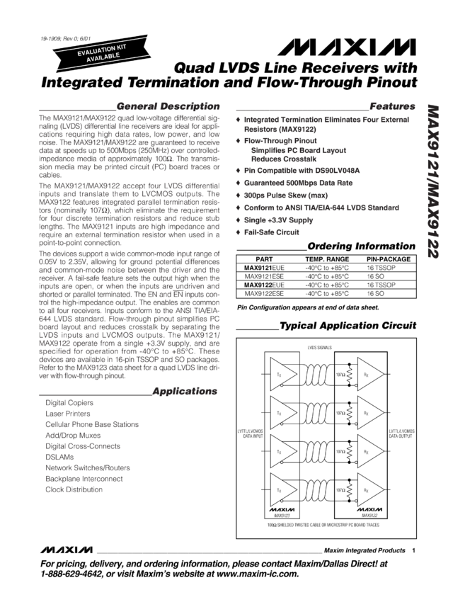 MAX9121, MAX9122 Quad LVDS Line Receivers with Integrated Termination and Flow-Through Pinout