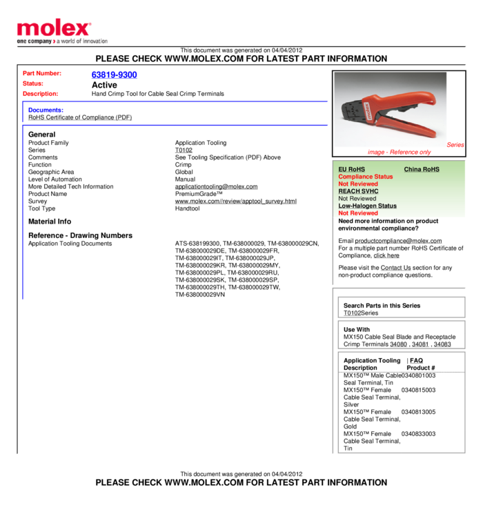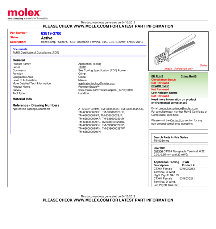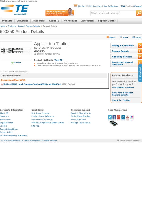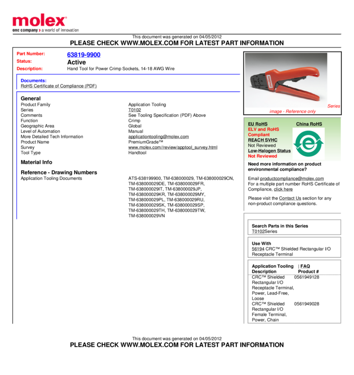 Hand Crimp Tool for 56194 Series CRC Shielded Rectangular I/O Receptacle Terminals