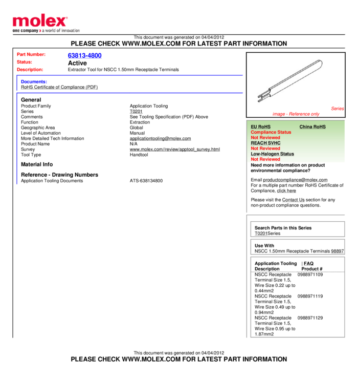 Extractor Tool for 98897 Series NSCC Receptacle Terminals