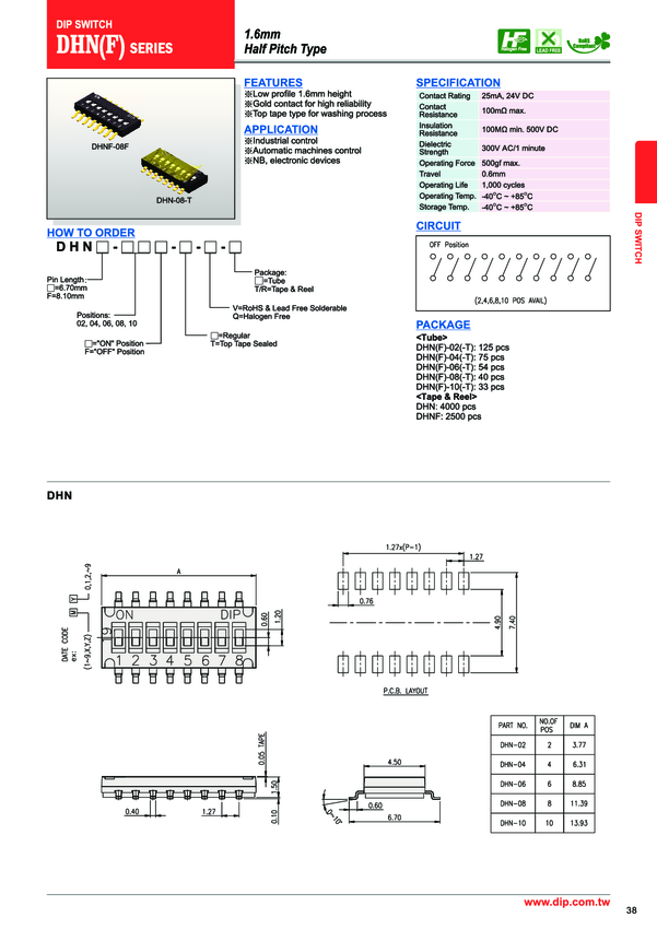 Switch DIP ON OFF SPST 6 Recessed Slide 0.15A 30VDC PC Pins 2000Cycle/SwitchCycle 2.54mm Thru-Hole Tube