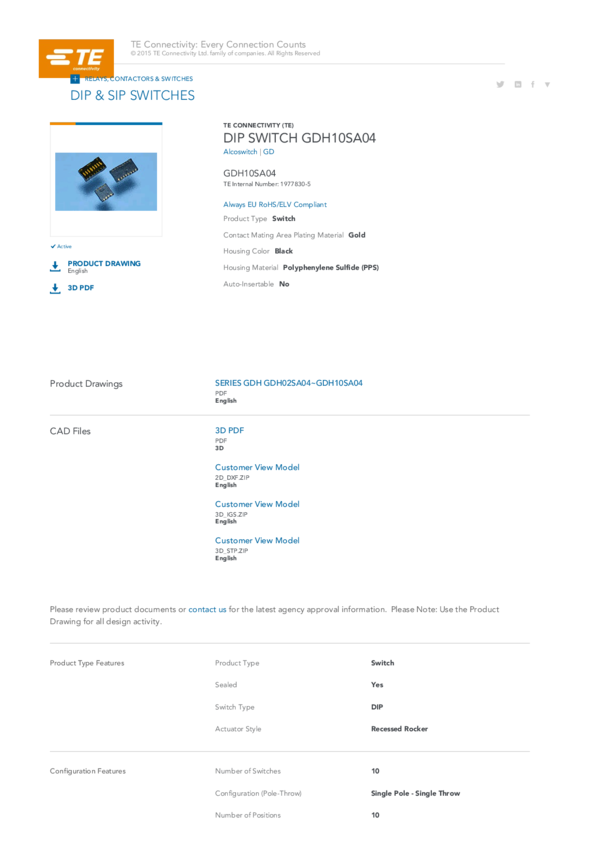 Switch DIP OFF ON SPST 10 Recessed Slide 0.0001A 0.0001VDC PC Pins 1000Cycle 2.54mm Thru-Hole Tube