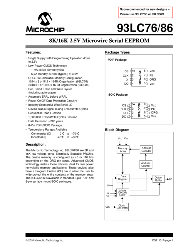 93LC76/86 Datasheet - Not Recommended for New Design (01/20/2010)
