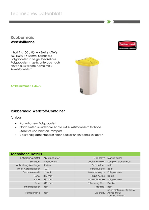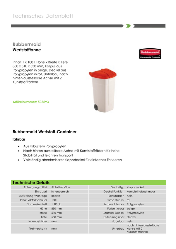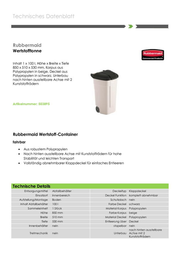 Rubbermaid 8713631021048 Kosz do recyklingu 100 l (S x W x G) 530 x 850 x 510 mm zielony N/A 1 szt.