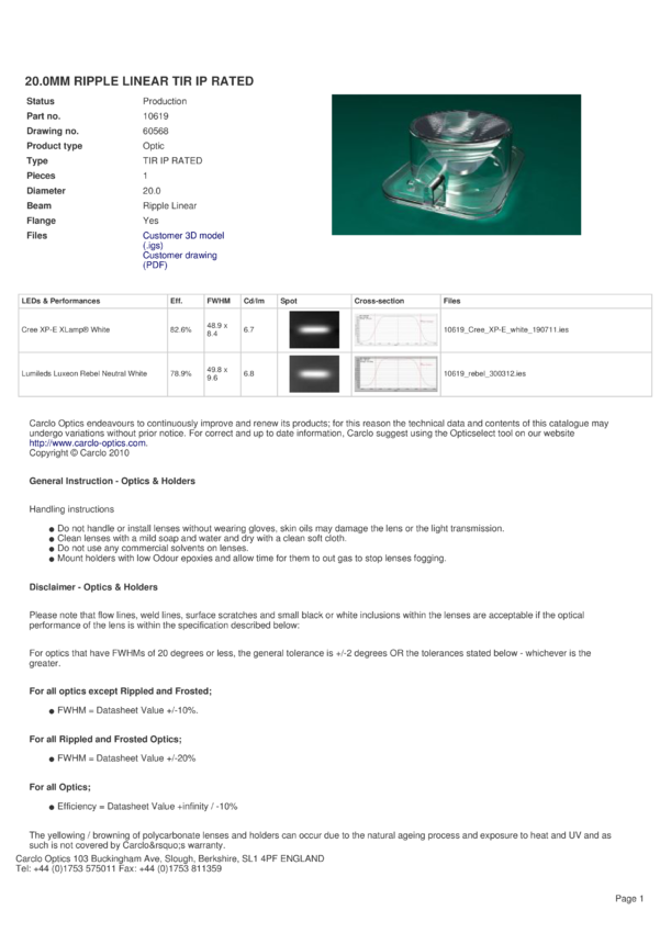 Soczewka Carclo 10619, do diod Cree serii XP-E, średnica 20mm, IP66, FWHM(XP-E):48,9&deg x 8,4°