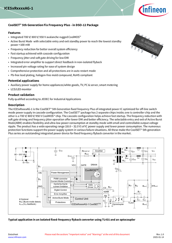 65 kHz offline flyback and buck controller with integrated 950 V CooMOS™ superjunction MOSFET supporting isolated and non-isolated topologies Regulation is made easy thanks to an integrated error amplifier for non-isolated topologies minimizing the external BOM. The DSO-12 package offers a high level of integration that provides a comprehensive suite of protection features, frequency jittering to minimize EMI, and frequency reduction in tandem with the decrease of load to improve overall efficiency. On top