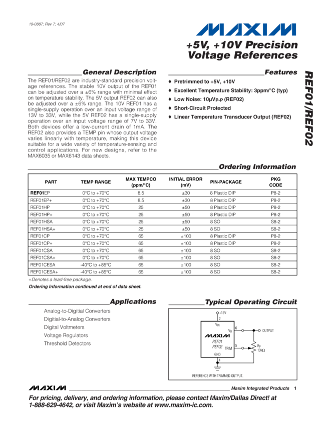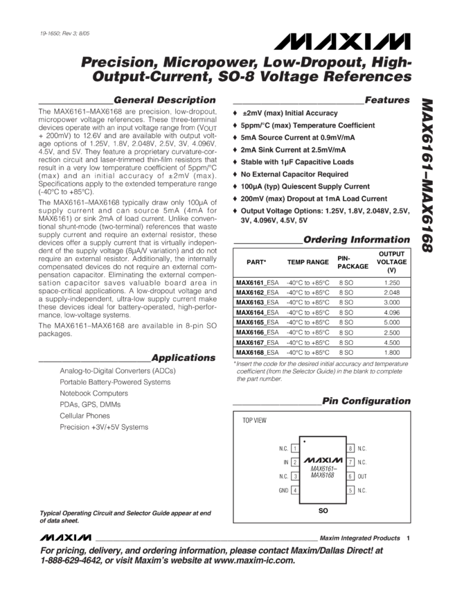MAX6161, MAX6162, MAX6163, MAX6164, MAX6165, MAX6166, MAX6167, MAX6168 Precision, Micropower, Low-Dropout, High-Output-Current, SO-8 Voltage References