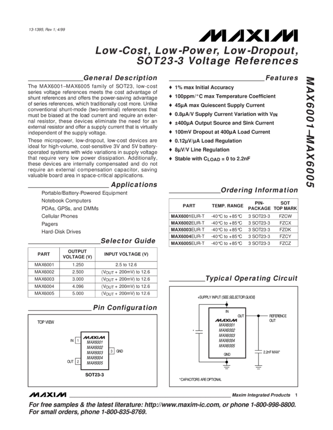 MAX6001, MAX6002, MAX6003, MAX6004, MAX6005 Low-Cost, Low-Power, Low-Dropout, SOT23-3 Voltage References
