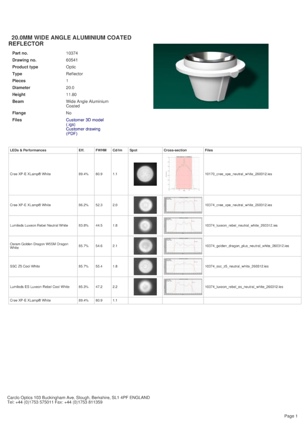 Reflektor Carclo 10374, do diod Cree serii XP-E, śr:20mm, wys:11,8mm, FWHM(XP-E):52,3&deg