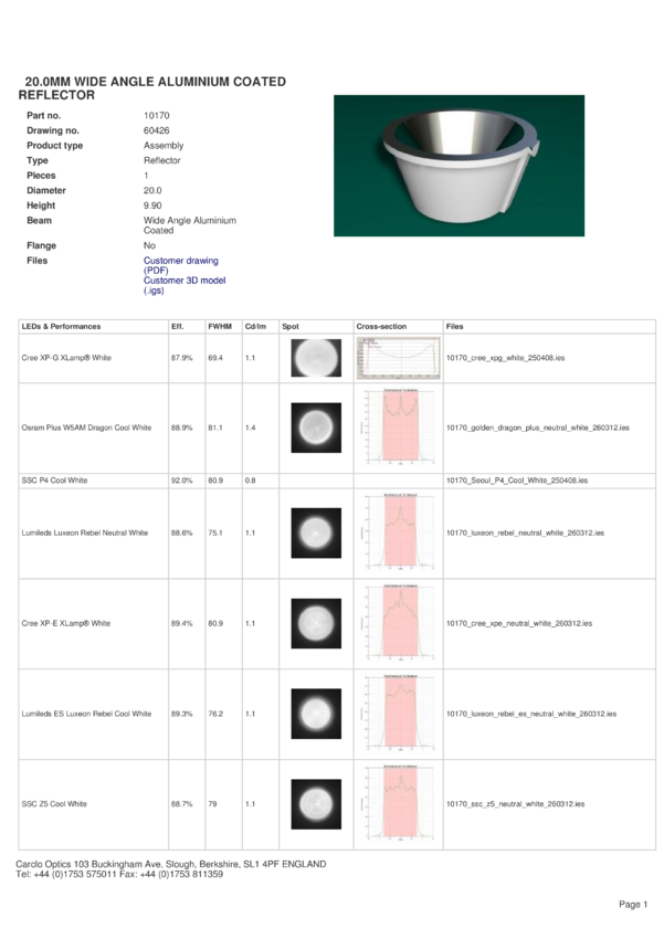 Reflektor Carclo 10170, szerokokątny, do diod Cree serii XP-G, XP-E,śr:20mm, wys:9,9mm, FWHM(XP-E):80,9&deg, FWHM(XP-G):69,4&deg