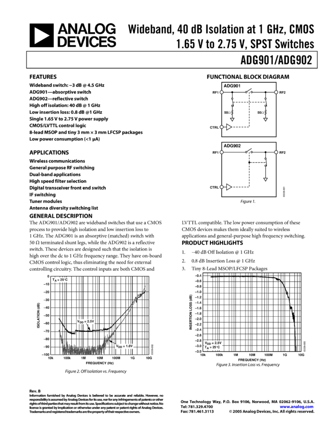ADG902: Wideband, 43 dB Isolation @ 1 GHz, CMOS 1.65 V to 2.75 V, Absorptive/Reflective Switches