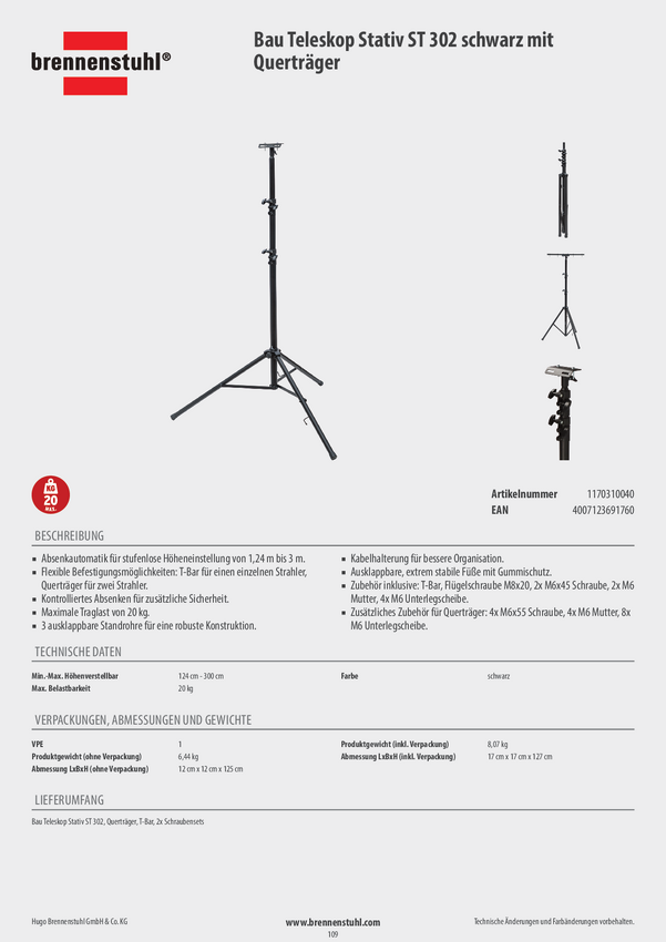 Statyw do reflektora roboczego Brennenstuhl ST 302 1170310040 Maksymalna długość statywu: 3000 mm