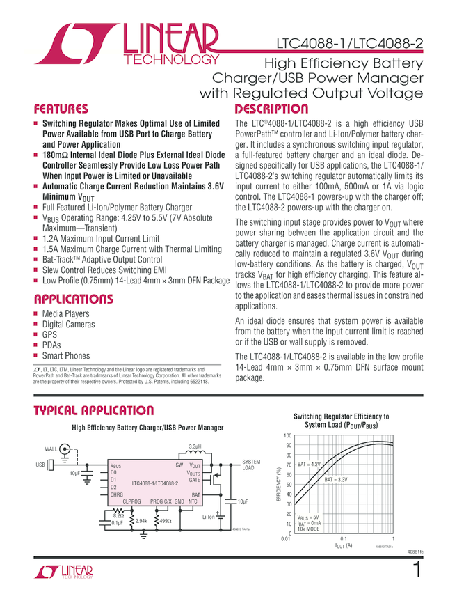 High Efficiency Battery Charger/USB Power Manager with Regulated Output Voltage
