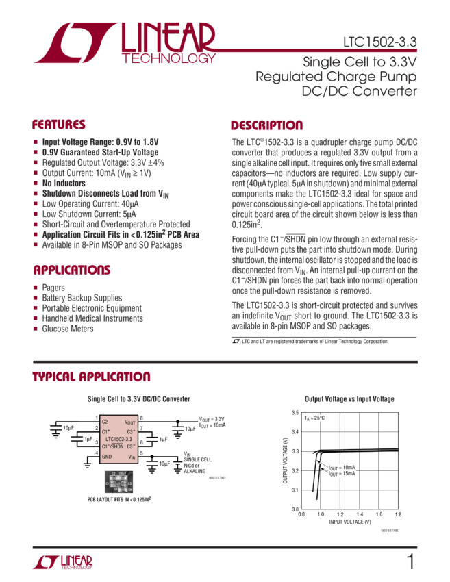 Single Cell to 3.3V Regulated Charge Pump DC/DC Converter