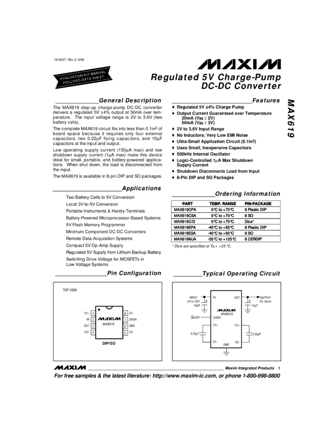 MAX619 Regulated 5V Charge Pump DC-DC Converter