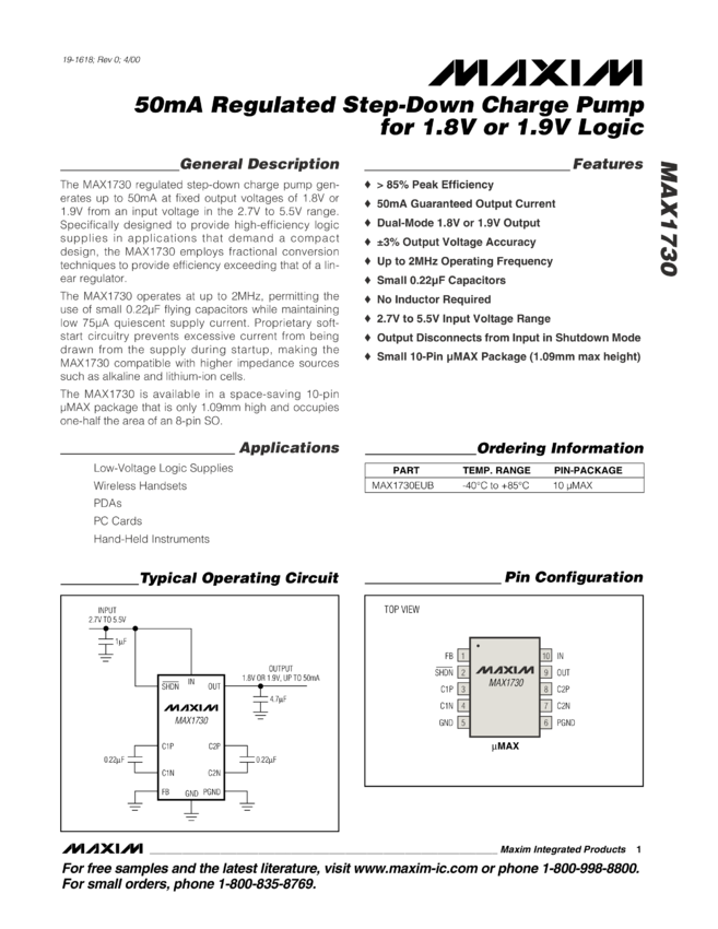 MAX1730 50mA, Regulated, Step-Down Charge Pump for 1.8V or 1.9V Logic