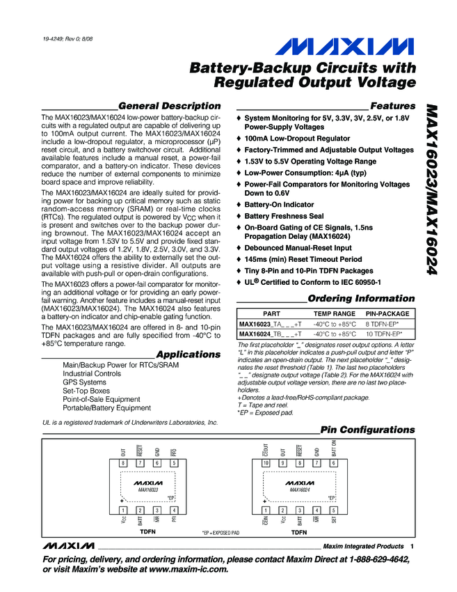 MAX16023, MAX16024 Battery-Backup Circuits with Regulated Output Voltage