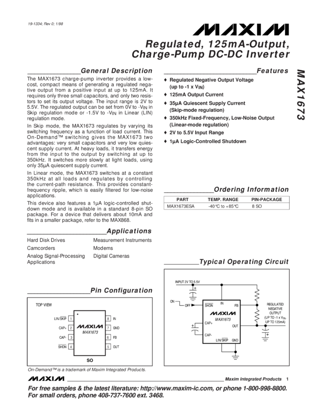 MAX1673 Regulated, 125mA Output, Charge Pump DC-DC Inverter