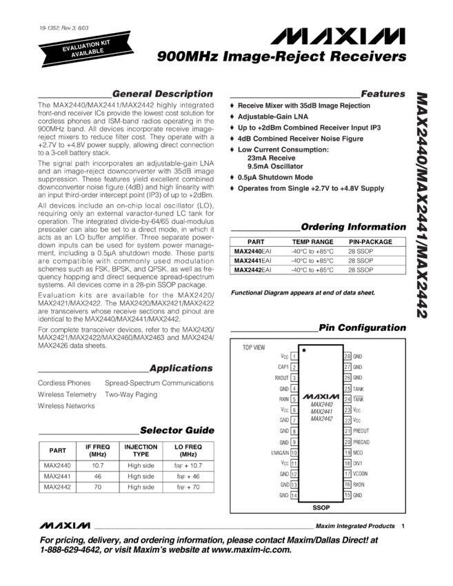 MAX2440, MAX2441, MAX2442 900MHz Image-Reject Receivers