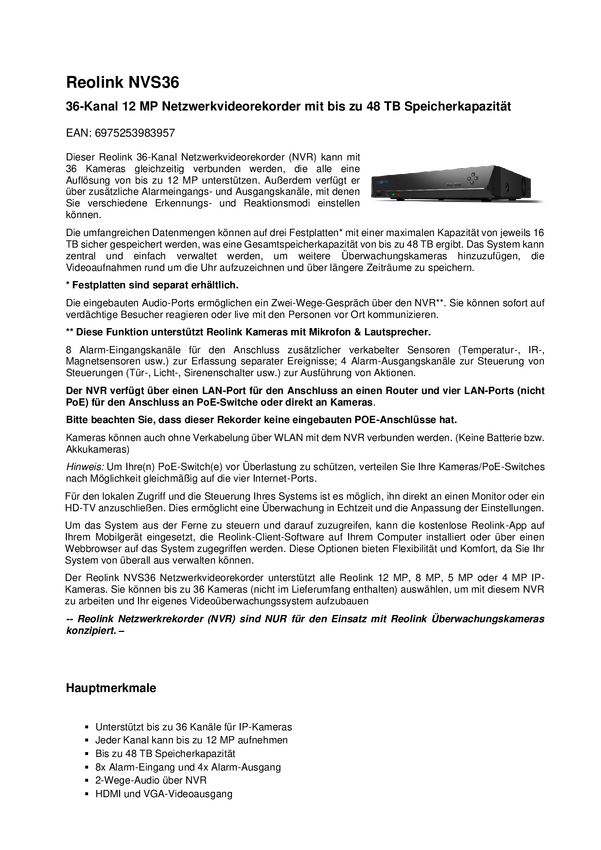 Rejestrator wideo sieciowy Reolink NVS36 36-kanałowy