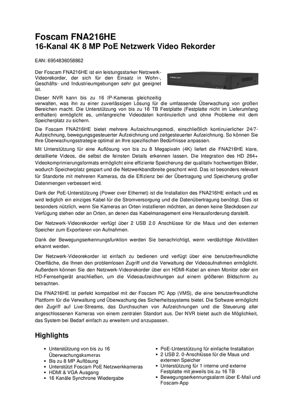 Rejestrator wideo sieciowy Foscam FNA216HE FNA216HE 16-kanałowy
