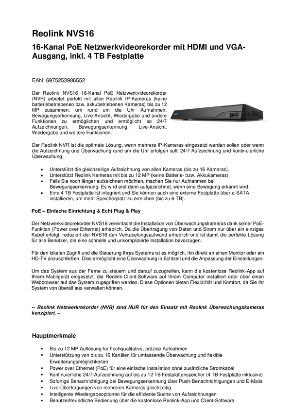 Rejestrator wideo sieciowy Reolink NVS16 16-kanałowy