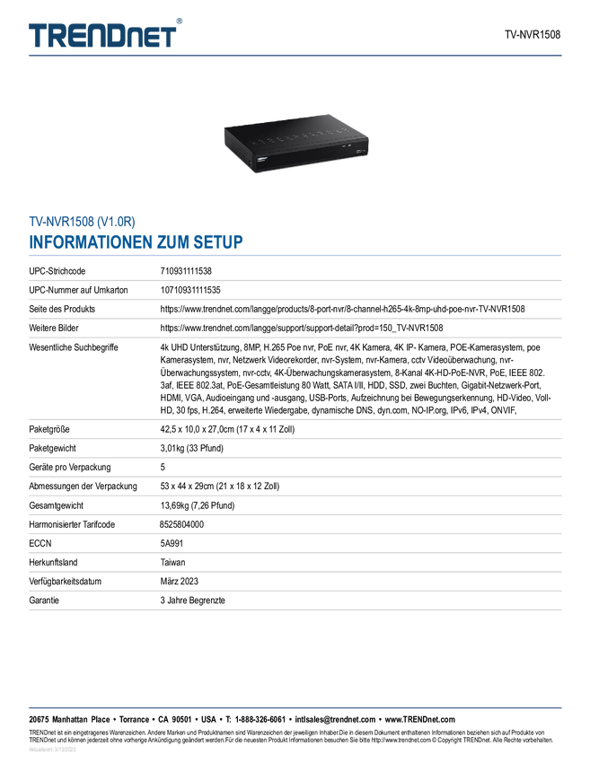 Rejestrator wideo sieciowy TrendNet Schloss / Zutrittskontrolle TV-NVR1508 8-kanałowy
