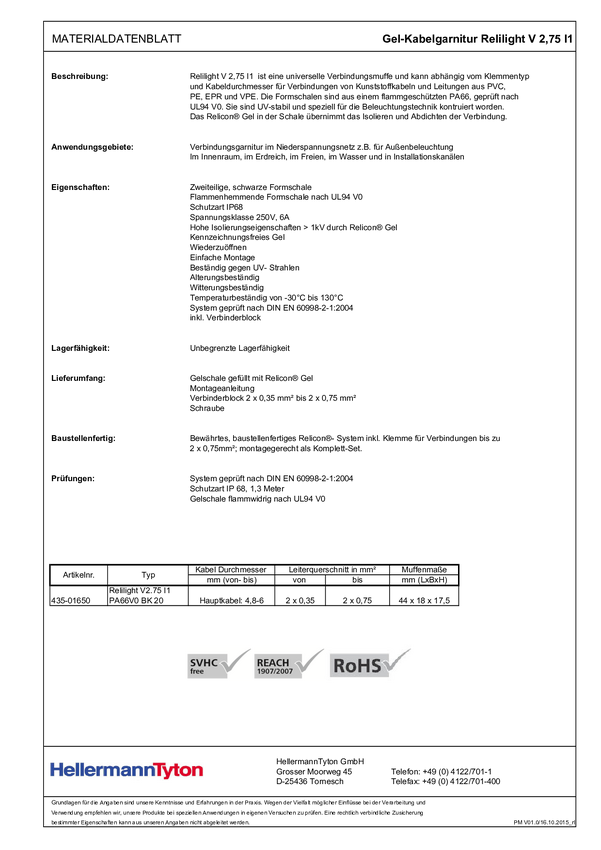 Relicon by HellermannTyton 435-01650 RELILIGHT V2.75 I1 PA66V0 BK20 Tuleja kablowa Zakres średnicy kabla: 4.80 - 6 mm Co