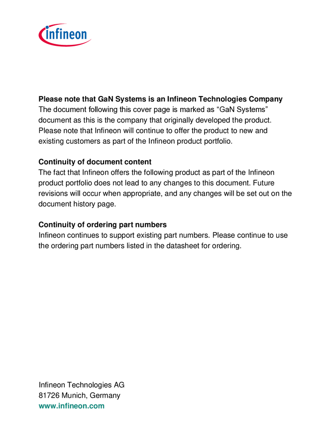 CoolGaN™ Transistor 650 V ≤ G3 for ultimate efficiency and reliability The GS-065-060-5-T-A-TR is an enhancement mode GaN-on-Silicon power transistor. The properties of GaN allow for high current and high switching frequency. The GS-065-060-5-T-A-TR is a top-side cooled transistor in a GaNPX® package with very low junction-to-case thermal resistance for high power applications such as on-board and off-board EV chargers, traction drive, ACDC and DCDC converters, industrial power supplies and renewable energ