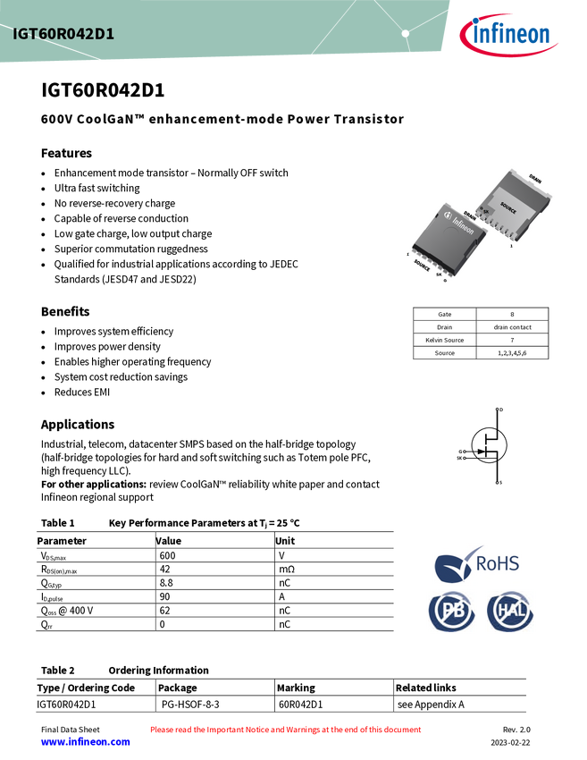 600 V CoolGaN™ e-mode power transistor for high power applications in bottom side cooled power package The IGT60R042D1 enables more compact topologies and increased efficiency at higher frequency operation. It is certified through an extensive GaN-specific qualification process, exceeding industry standards. Housed in the bottom-side cooled HSOF-8 package, it is designed optimal power dissipation required in modern data centers, server , telecom , renewables and numerous other applications.