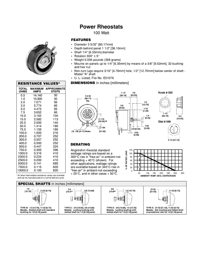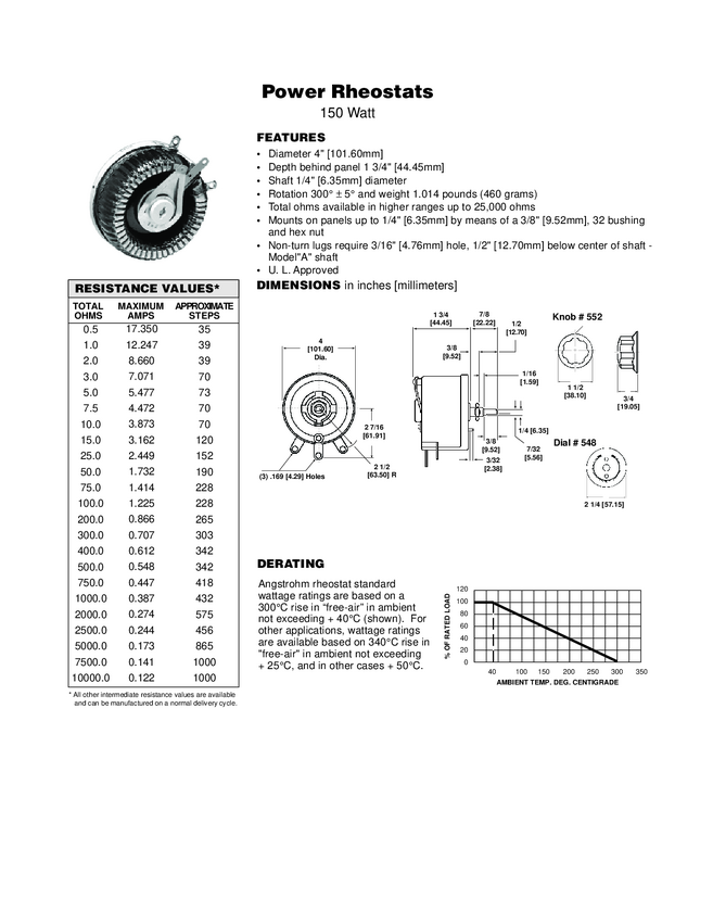500W-potencjometr drutowy Reostat - dużej mocy 1 obrotowy 325 stopni; średnica 8,00"=203,2mm; gł=53,98mm; ośka 0,375" =9,53mm ze ścięciem; dł.2"=50,8mm Waga ok. 2kg z opakowaniem fabrycznym nawet 8 kg Moc 500W; Vmax= 1450 V RMS Imax= Rezystancja =