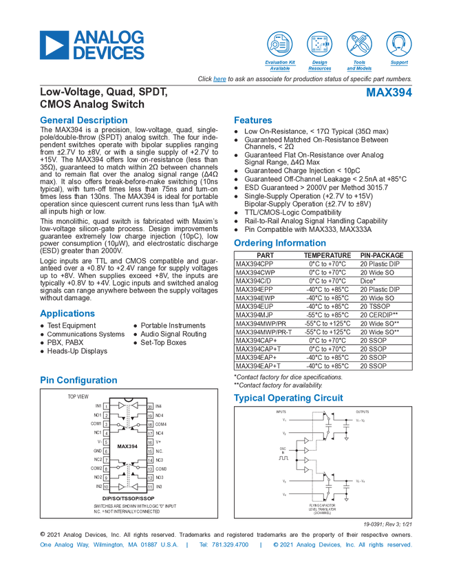 MAX394 Low-Voltage, Quad, SPDT, CMOS Analog Switch—Replaces MAX333A