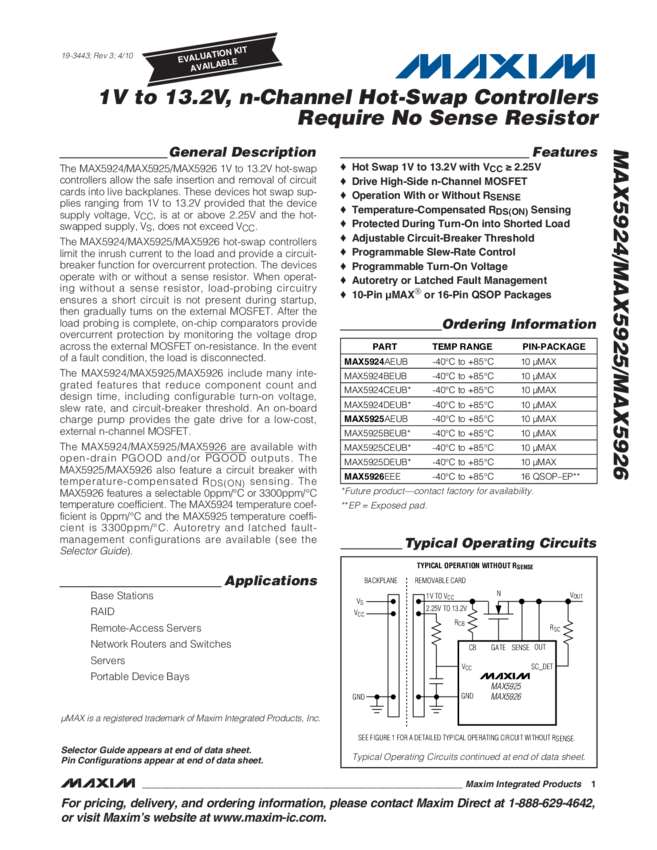 MAX5926 1-13.2V Hot-Swap Controller Requires No Rsense