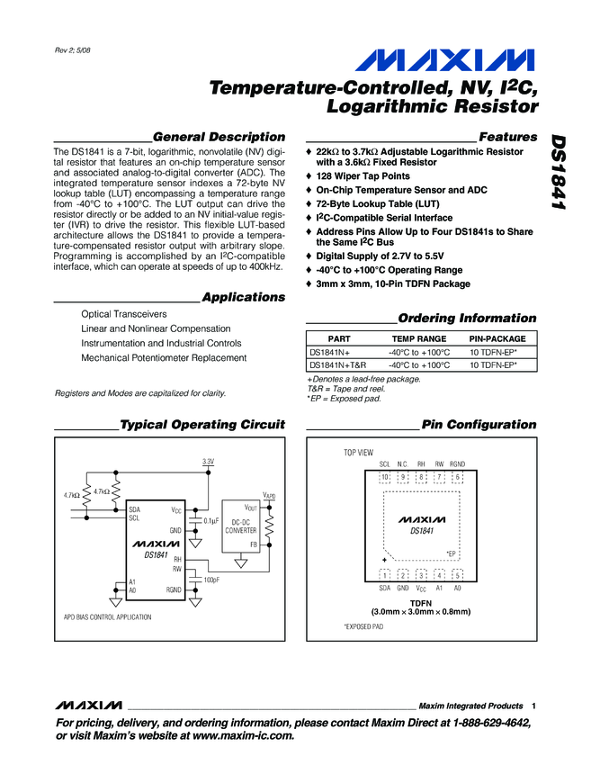 DS1841 Temperature-Controlled, NV, I²C, Logarithmic Resistor
