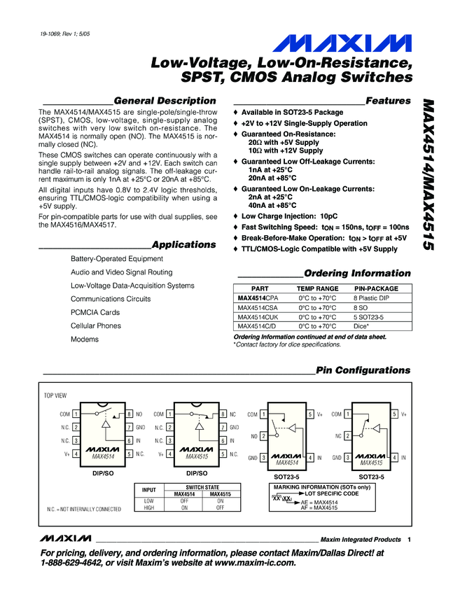 MAX4514, MAX4515 Low-Voltage, Low-On-Resistance, SPST, CMOS Analog Switches