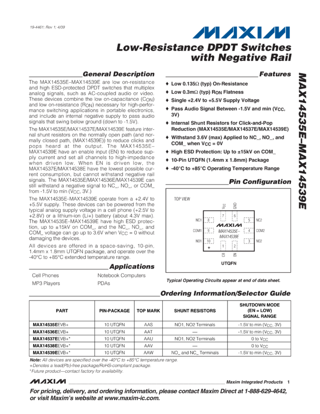 MAX14535E, MAX14536E, MAX14537E, MAX14538E, MAX14539E Low-Resistance DPDT Switches with Negative Rail