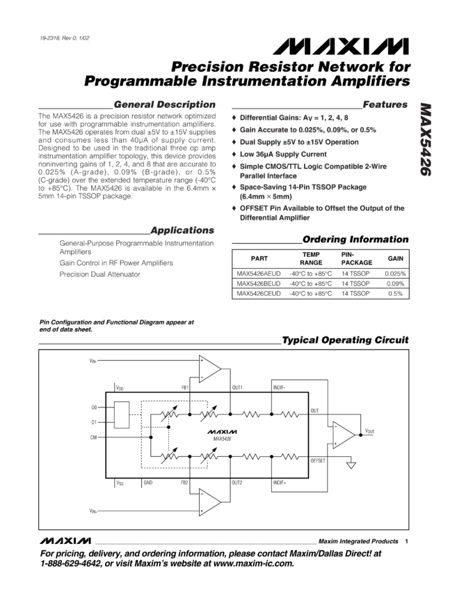 MAX5426 Precision Resistor Network for Programmable Instrumentation Amplifiers