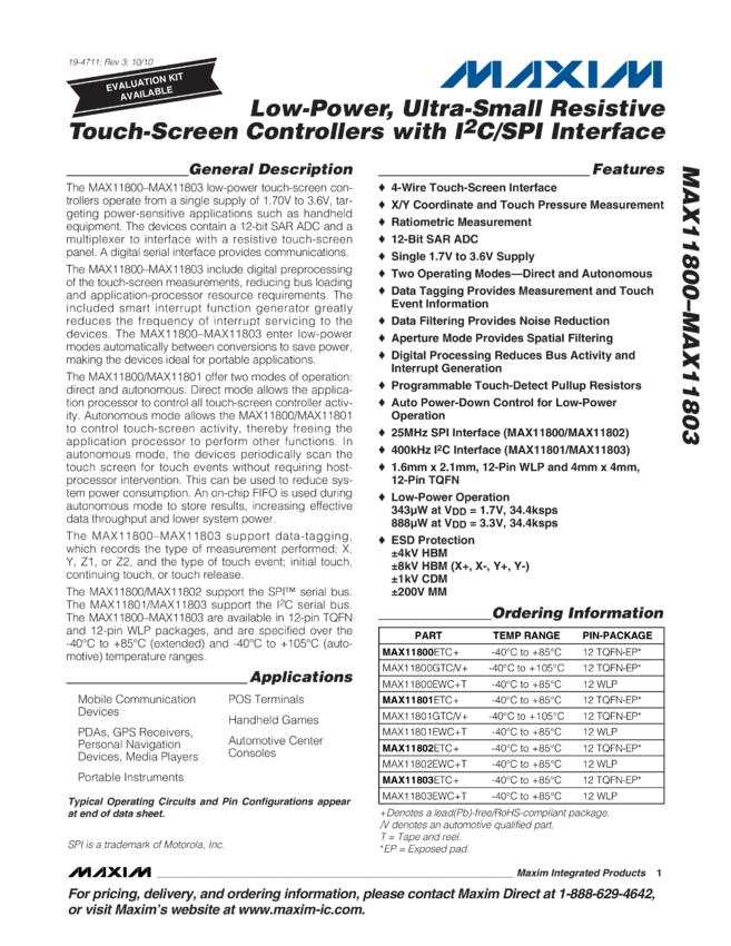 MAX11800, MAX11801, MAX11802, MAX11803 Low-Power, Ultra-Small Resistive Touch-Screen Controllers with I²C/SPI Interface