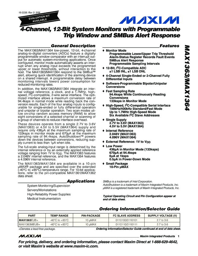 MAX1363, MAX1364 4-Channel, 12-Bit System Monitors with Programmable Trip Window and SMBus Alert Response