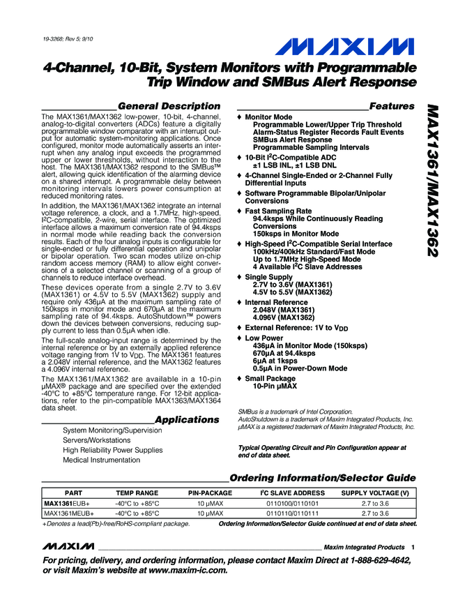MAX1361, MAX1362 4-Channel, 10-Bit, System Monitors with Programmable Trip Window and SMBus Alert Response