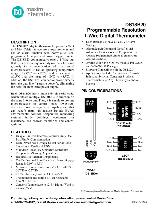 DS18B20 Programmable Resolution 1-Wire Digital Thermometer