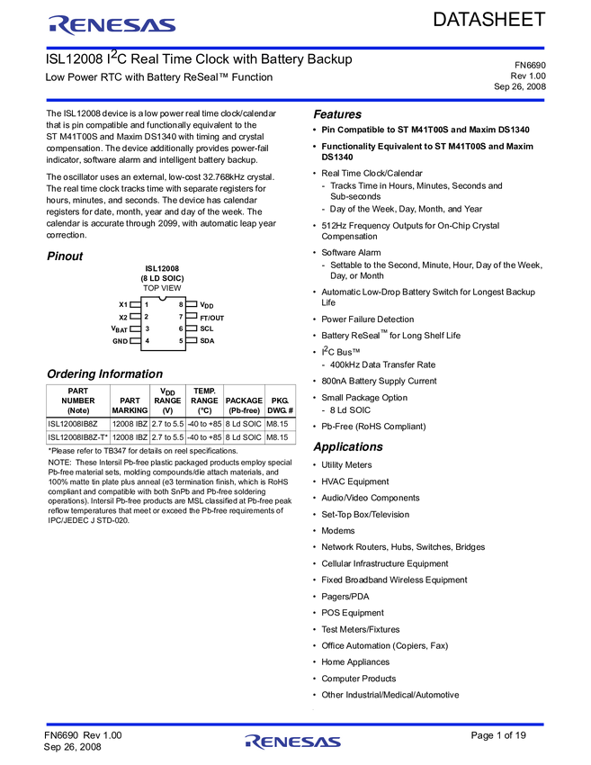 IC-Bus™ Real Time Clock with Two Interrupts, Alarm, and Timer Low Power RTC with Battery ReSeal™, 2 IRQs, Hundredths of a Second Time, and Crystal Compensation