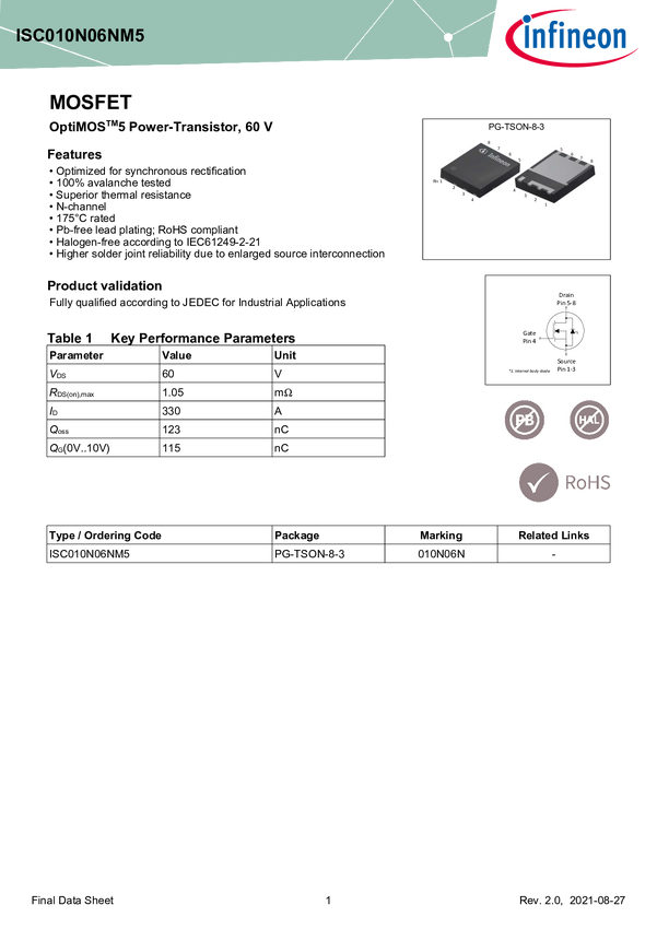 OptiMOS™ 5 Single N-Channel Power MOSFET 60 V, 1.05 mΩ, 330 A in a SSO8 package OptiMOS™ 5 power MOSFET 60 V in SuperSO8 package (ISC010N06NM5) offers low on-state resistance RDS(on) at 25˚C and 175˚C, and high continuous current (up to 330 A), enables higher power density in addition to improved robustness, responding to the need for lower system cost and increased performance.