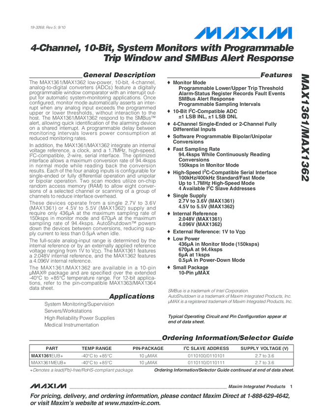MAX1362 4-Channel, 10-bit, System Monitors with Programmable Trip Windows and SMBus Alert Response